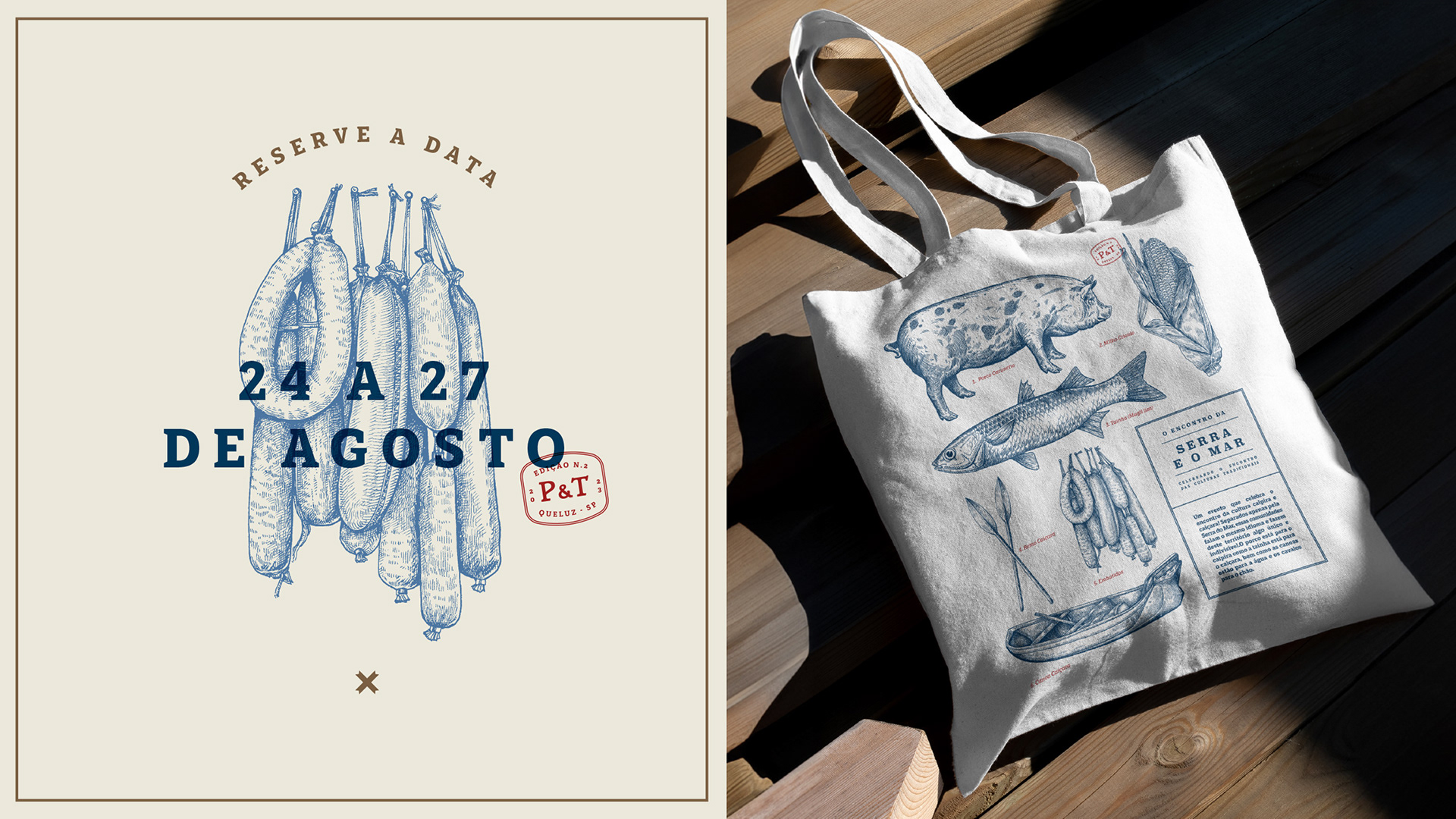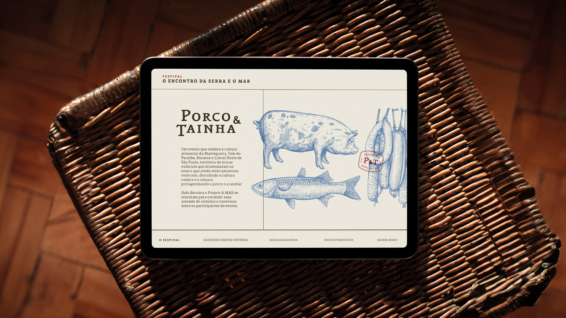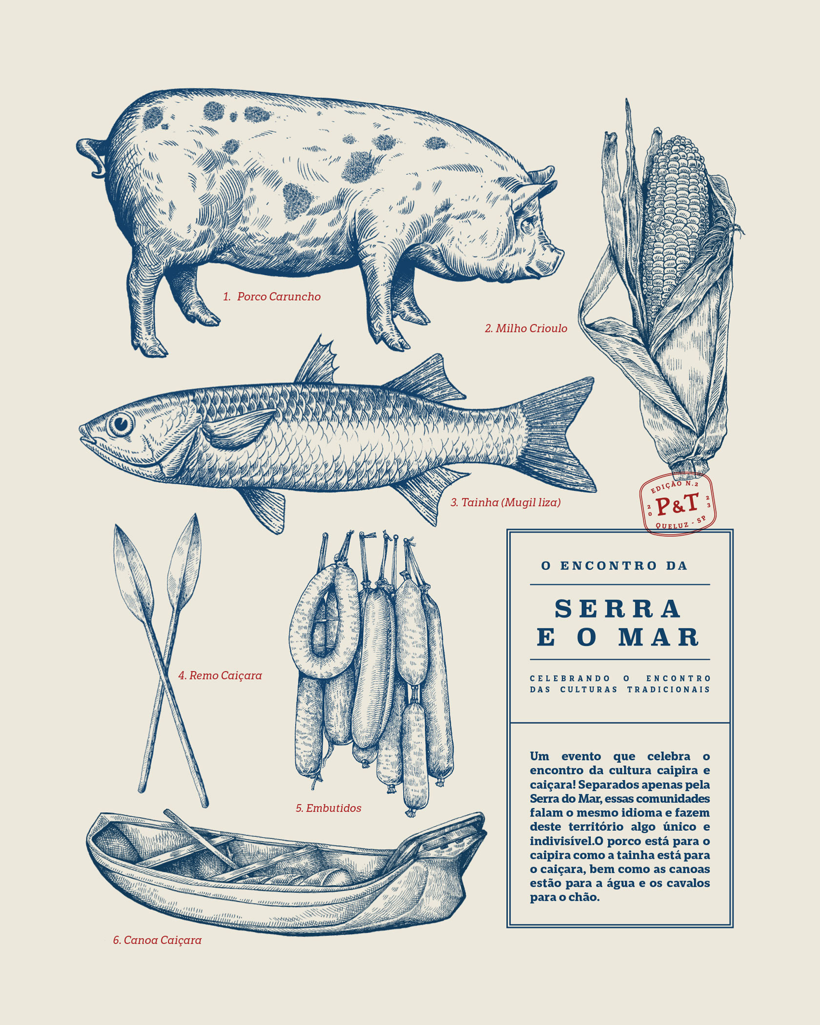 "Porco & Tainha" is an event held by Fazenda Santa Vitória. This visual identity project was made in partnership with Arado and Lasca and it aims to consolidate the "caipira" and "caiçara" imaginary as something indivisible. The brand dialogue with the cultural transit between the Coast, the Mountains, and the Paraíba Valley. Research and General Management: Arado Art direction: Arado e Lasca Creation and Development: Lasca Illustrations: Nicole Bustamante and Lasca Photos: André Yamamoto