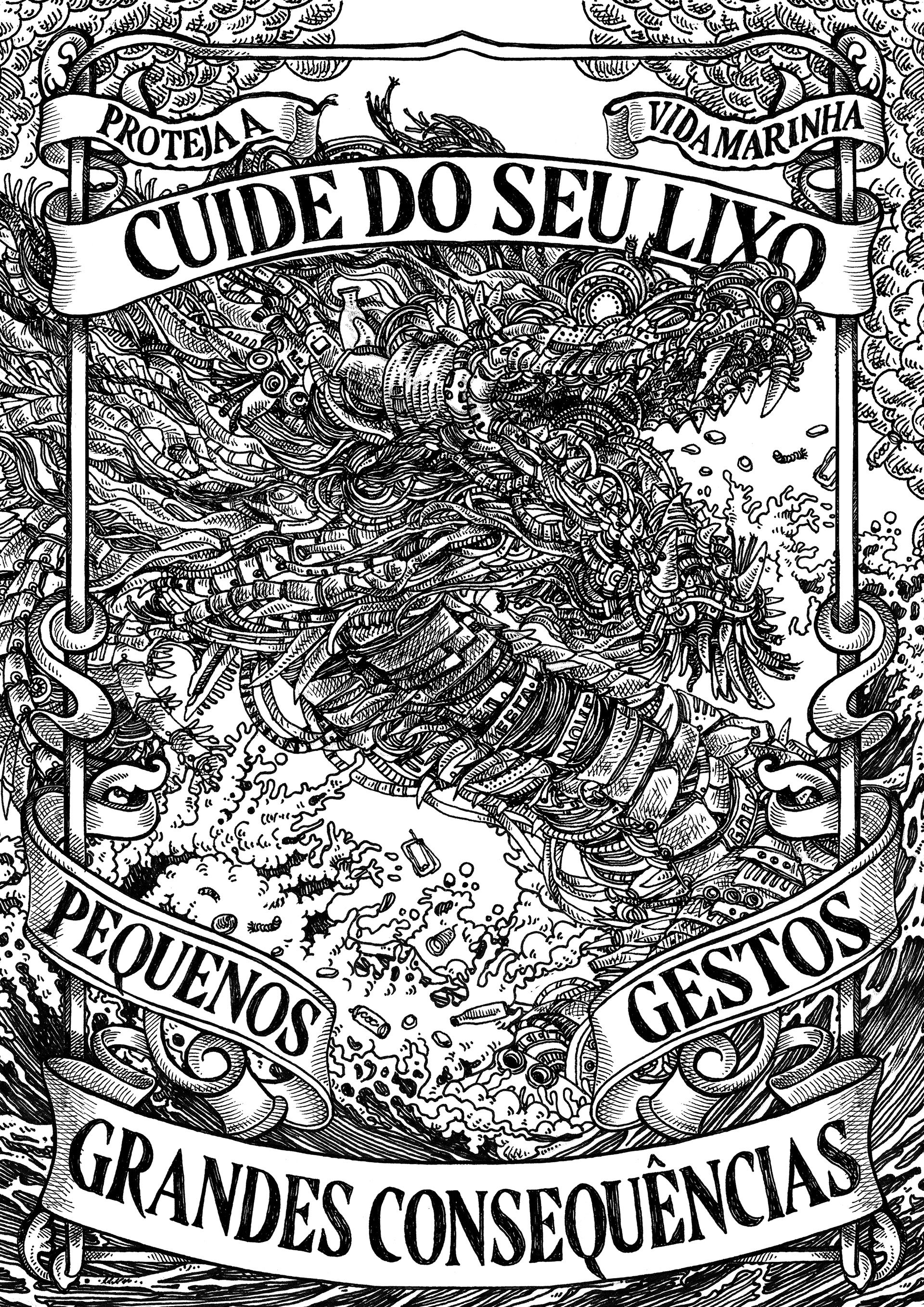 The NGO Move Institute, which is at the forefront of the #bitucamata (something like "cigarette butt kills") awareness campaign against litter in urban spaces, invited me to create art that would demonstrate negative the impact in the marine life caused by small pieces of garbage abandoned by passers-by in public places. A series of handmade posters will be distributed in bars and restaurants in São Paulo that will be covered with awareness material.