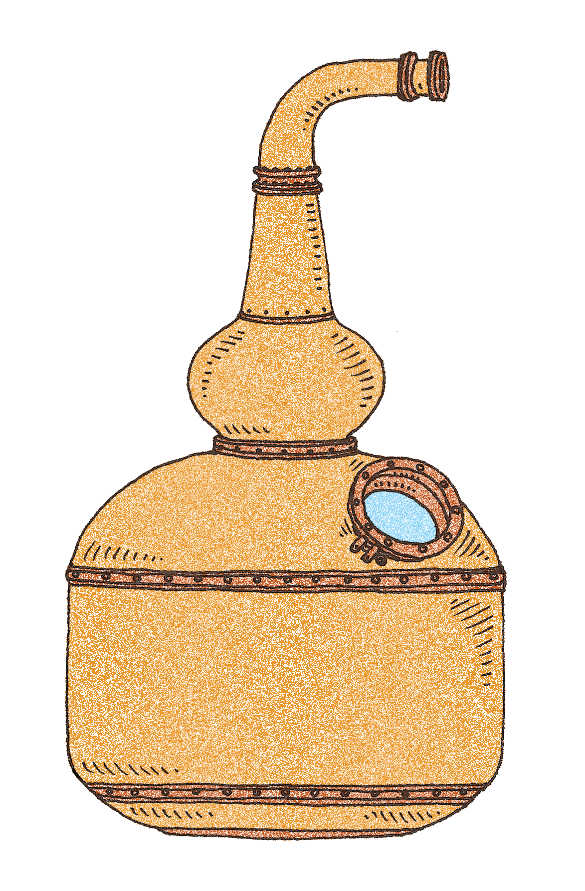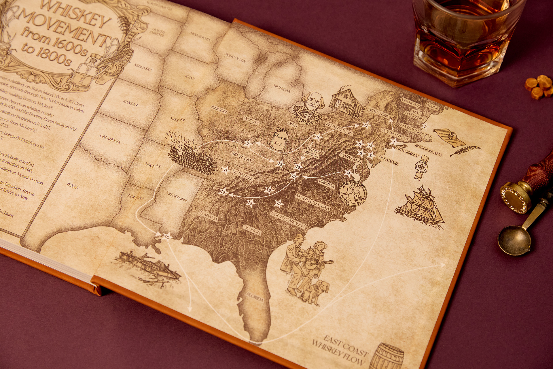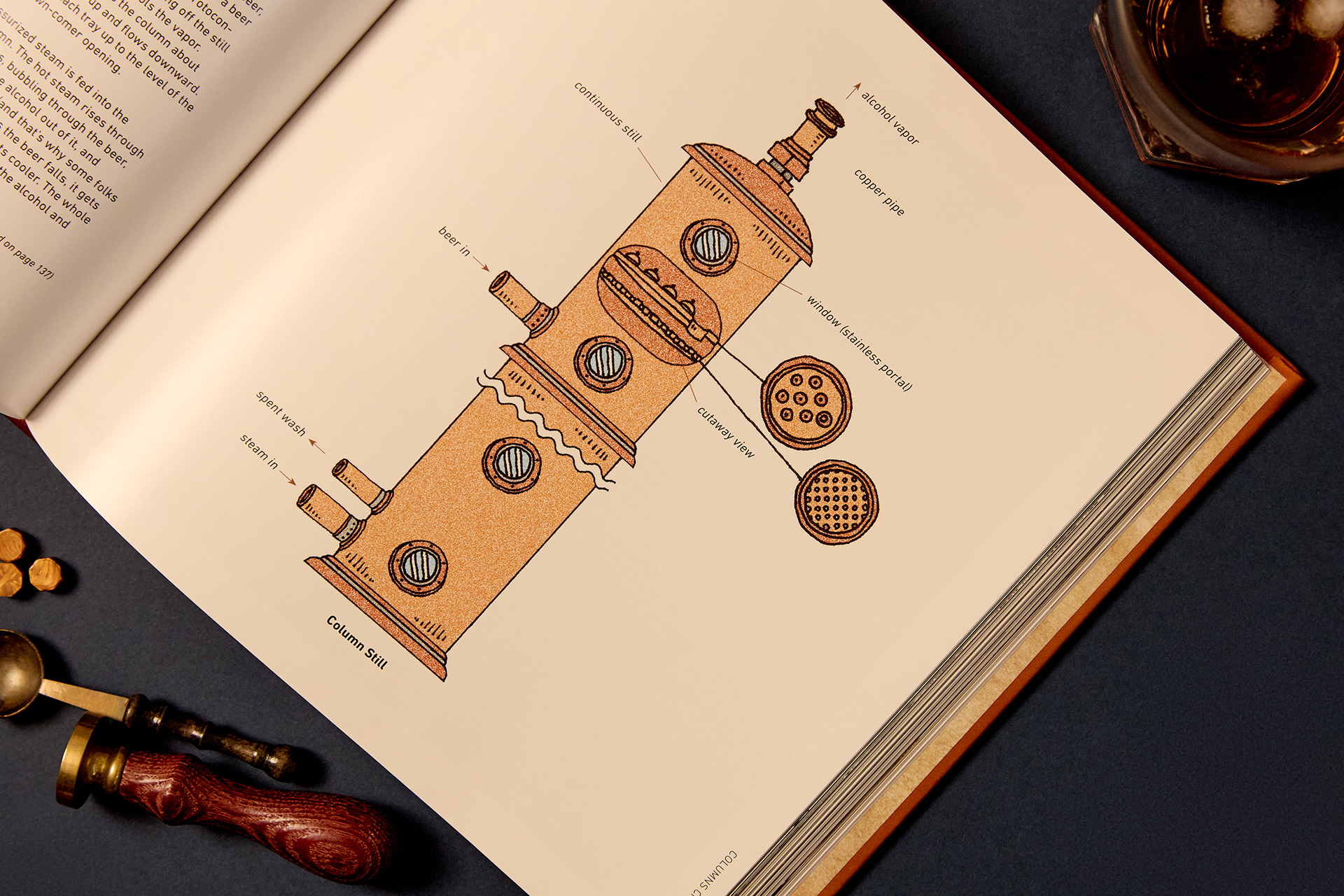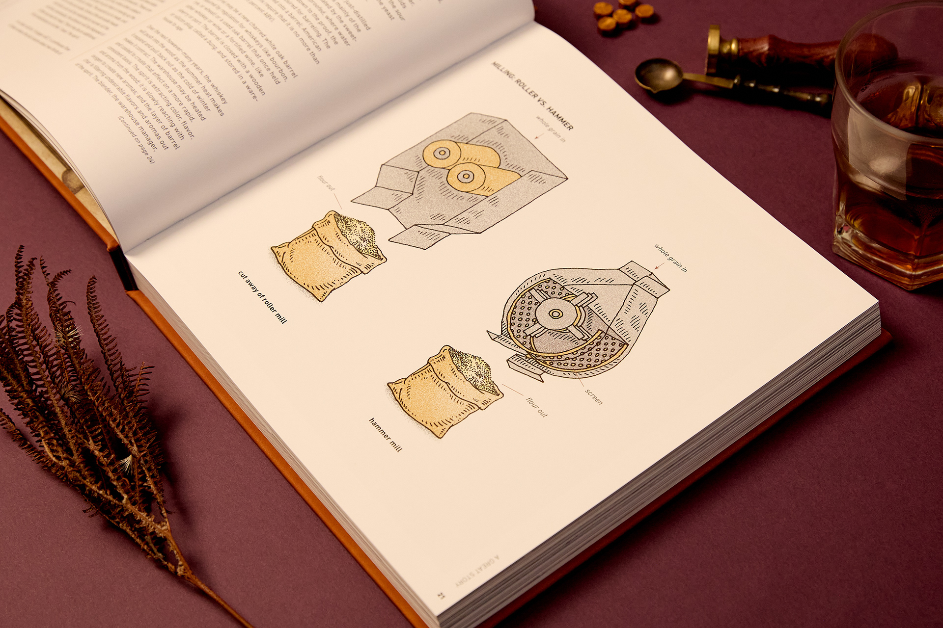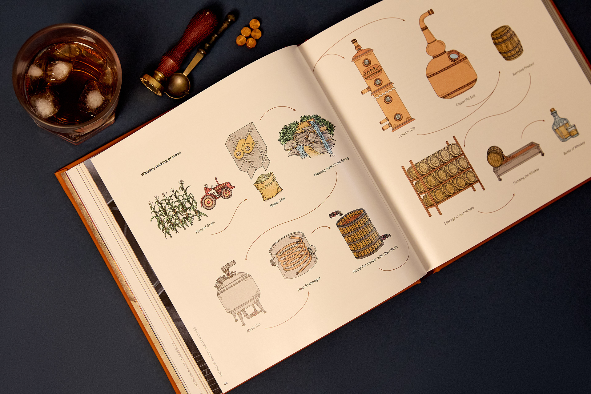Illustrations created for a Special Edition of "American Whisky Master Class" by Lew Bryson. Hand-drawn map illustration for the endpaper and interior illustrations that help understand the whisky production process, all inspired by vintage technical manuals.