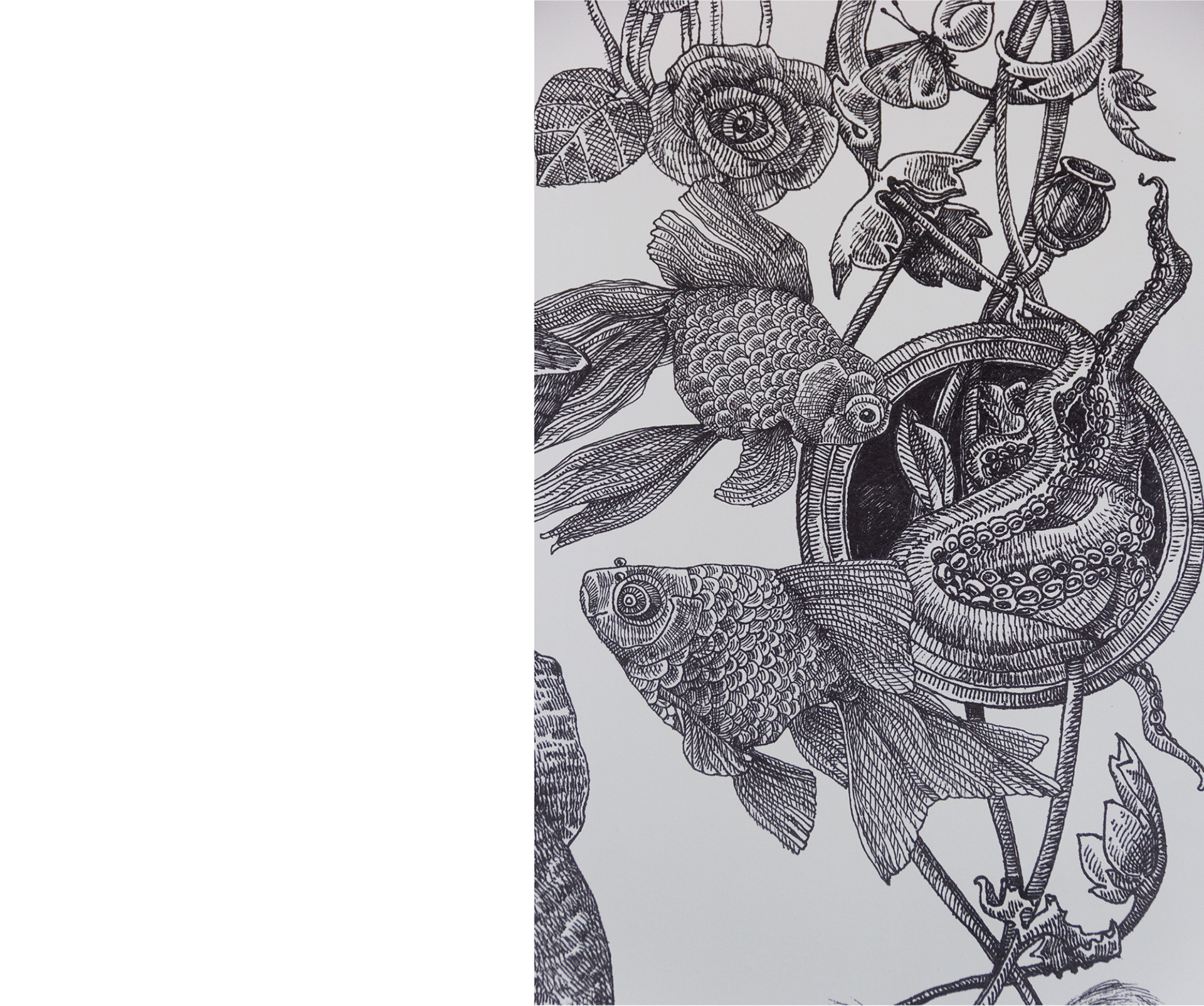 In 2021, SESC Santo André (a Brazilian non-profit private institution) presented an exhibition that brought the personal interpretation of eight different artists of the literary work Alice in Wonderland. Each artist illustrates one (or more than one) chapter of the work. This exhibition is a hybrid project composed of online actions and a physical exhibition (open under special conditions due to the COVID-19 pandemic) that took place in the association's corridors until the end of September 2021. All the different illustrated panels created the illusion that, as you walk through the halls of the exhibition, you walk through the chapters of the book. "Um Chá Maluco" or "A Mad Tea Party" is the chapter that designates and names the work I proposed for the exhibition. A panel with three plates, all hand-illustrated in ink.